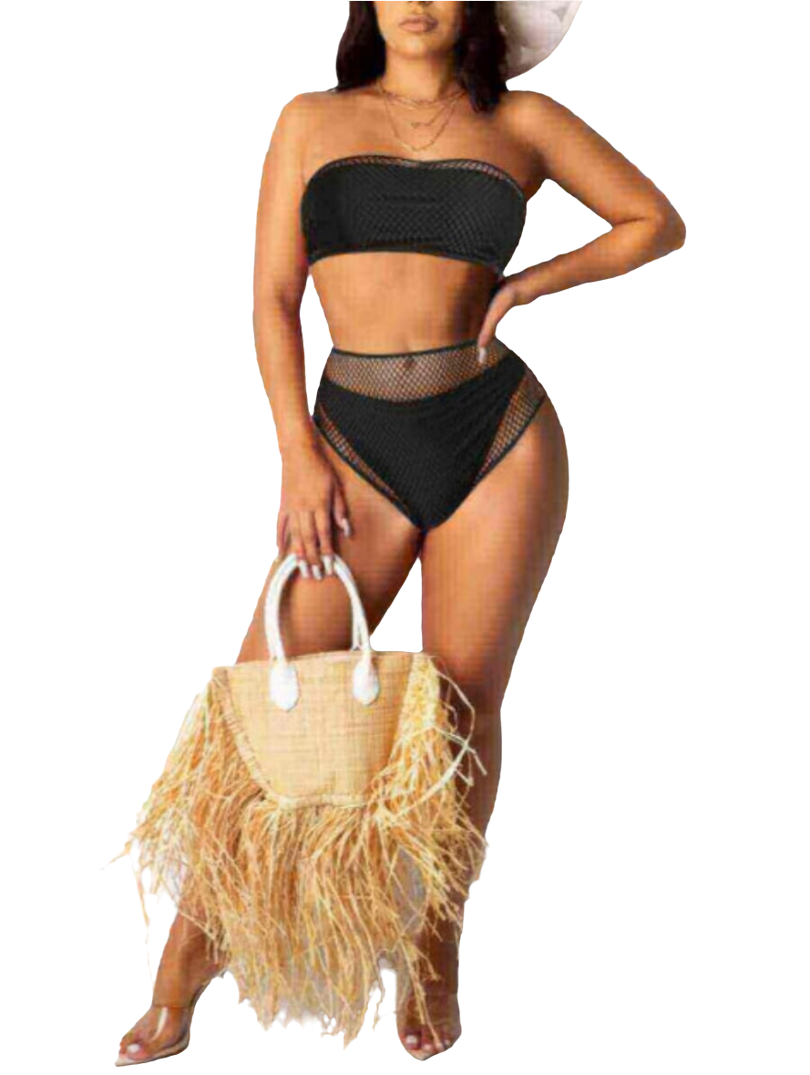 Get ready to make a statement at the beach or pool with our CAUSAL OFF THE SHOULDER SEE-THROUGH PATCHWORK BLACK TWO-PIECE SWIMSUIT. Made with polyester material, this vacation-style swimsuit features a padded, strapless top and high-waisted bottoms in a sleek solid black color. Stay comfortable and confident all day with this trendy and stylish swimsuit.
