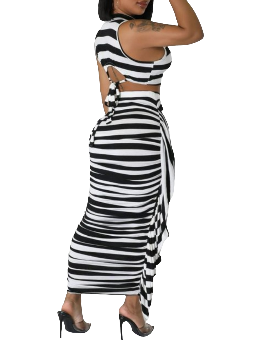 This two-piece skirt set is made of polyester material and consists of a round neck vest and a striped sleeveless skirt. The black and white color scheme lends to a casual and solid look, making it a versatile addition to any wardrobe. Perfect for any occasion, from casual outings to business meetings.
